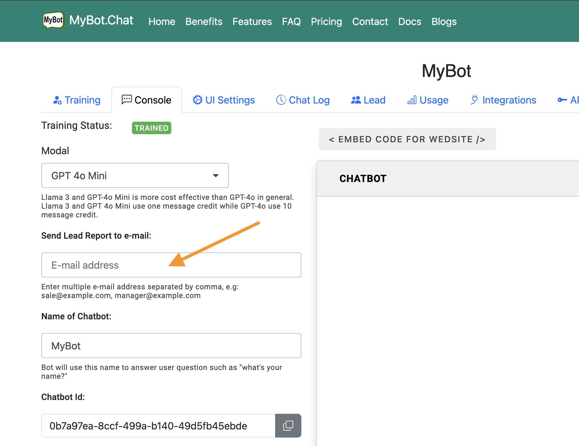 Quick StartCreate New ChatbotTrain Chatbot with TextTrain Chatbot with FilesTrain Chatbot with Q&AEnable GPT-4o vision and let user chat with pictureConfigure Chatbot to send lead report to e-mail address