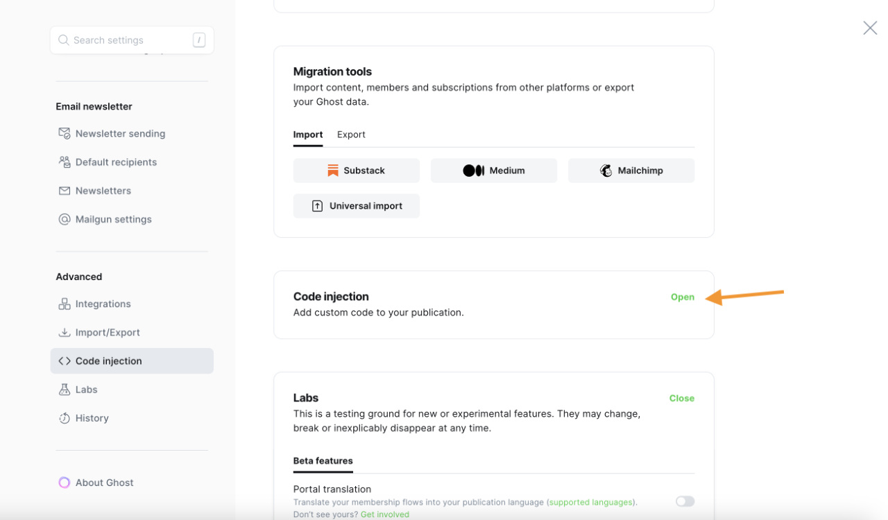 On the setting page, scroll the left navigation bar to the bottom to find the Code Injection option as in the picture and click on Open on the right