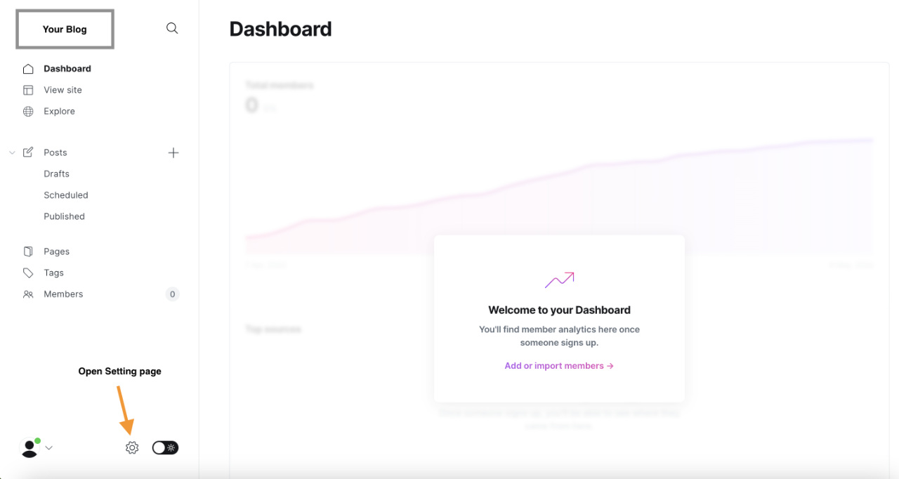 Log in to your Ghost blog dashboard and find the setting icon at the bottom left of the screen