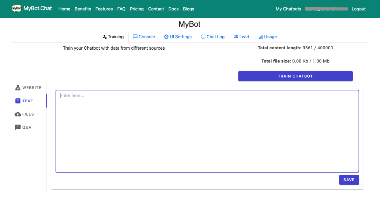 On this Training page, look at the left navigation and select Text tab to see the text area where you can enter your content. Click Save to save it for training.